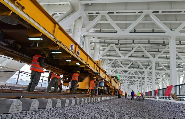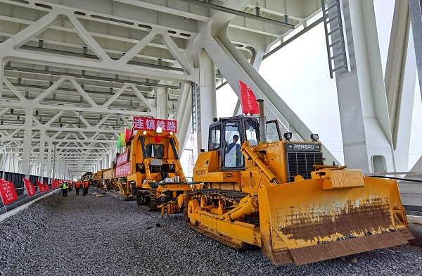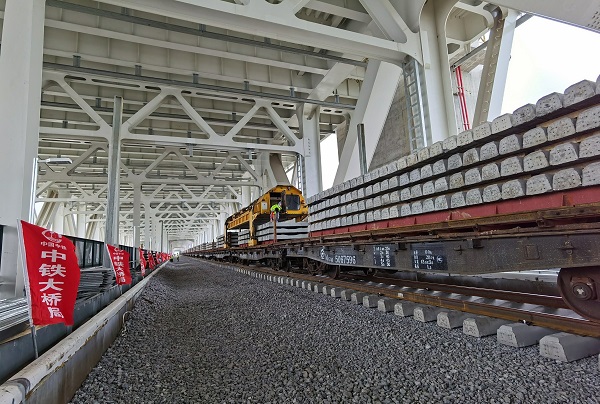 据中铁大桥局连镇铁路项目部现场技术人员介绍,五峰山长江大桥铁路桥面为双线有砟轨道,铺轨工作由中铁十七局连镇铁路项目部负责,采用CPG500铺轨机组铺设,先铺枕木,再架轨道,铺设用的铁轨是由五根100米长的钢轨在预制场内焊接成500米的铁轨,每根铁轨重约30吨。至4月17日下午,五峰山长江大桥铁路桥面单轨铺轨工作顺利完成。接下来,自动铺轨机组将按照计划继续向镇江方向铺轨,尽快实现全线贯通。