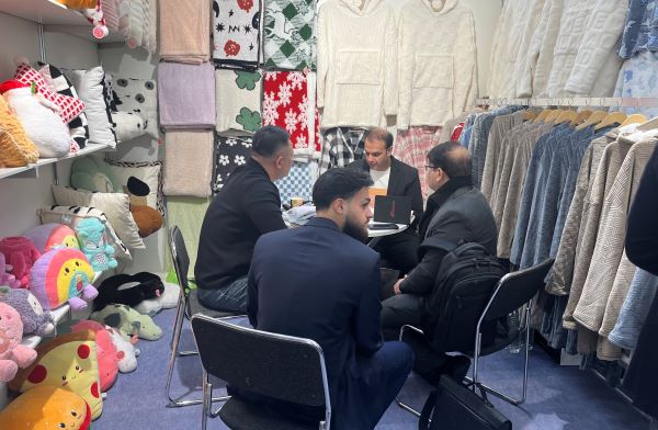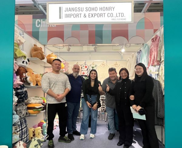 此次参展,苏豪泓瑞高度重视,从展位设计、产品陈列到宣传推广精心筹备。以靠垫、毯子及家居服为核心,推出三大主题系列产品,吸引全场瞩目。其中,毛绒毯子以柔软亲肤的触感和多样化的设计风格成为焦点,搭配家居服系列的高端面料与时尚剪裁,吸引了多家老客户现场下单。圣诞节日款靠垫、氨纶蔬菜水果造型的异形靠垫以及婴儿款口水巾毯子等创新产品,凭借独特的设计和实用功能,成为欧美客户的热门选择。展会期间,苏豪泓瑞展台人头攒动,前来咨询、洽谈的客户络绎不绝。加拿大、意大利客户对异形靠垫和圣诞主题产品表现出强烈兴趣,部分客户已进入选品和洽谈订单阶段;巴基斯坦客户再续合作,进一步巩固了苏豪泓瑞在巴基斯坦面料供应链中的重要地位。