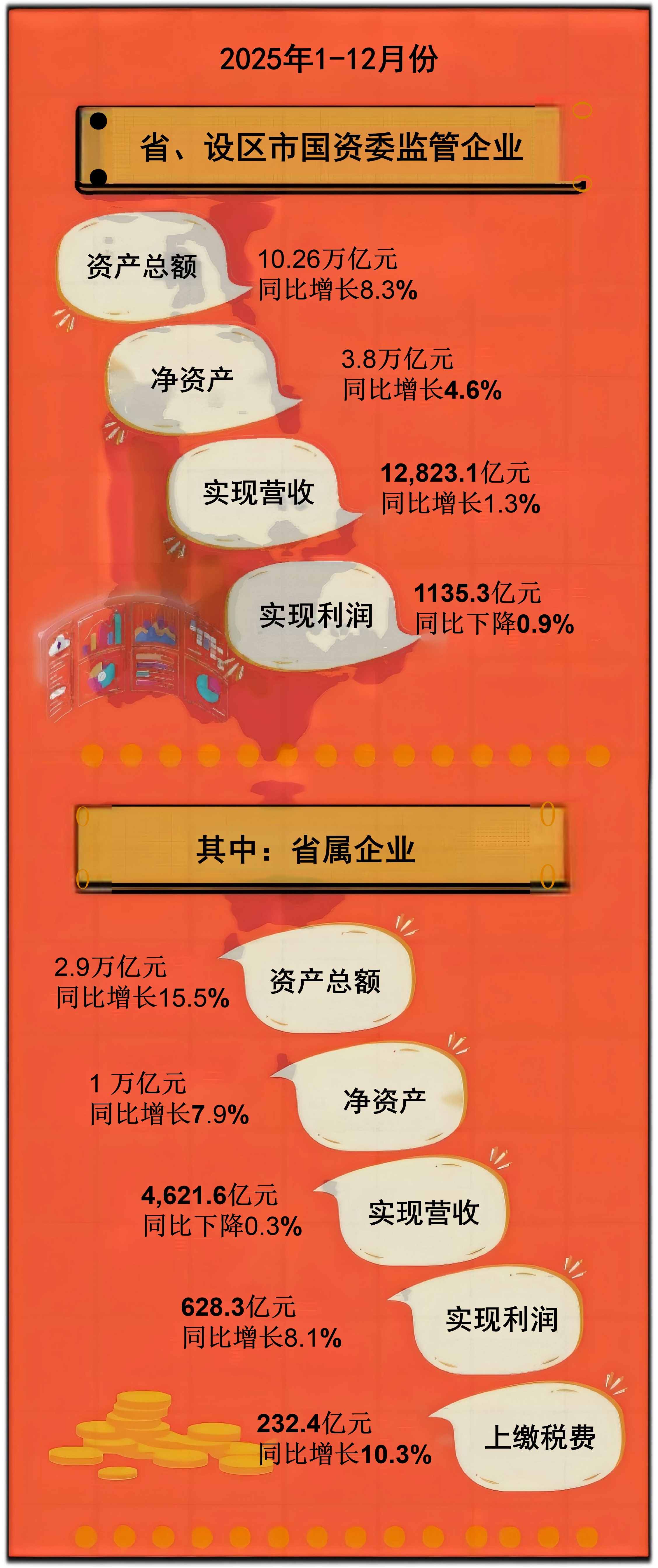 12月末,省、设区市国资委监管企业资产总额10.26万亿元、净资产3.8万亿元,同比分别增长8.3%、4.6%。