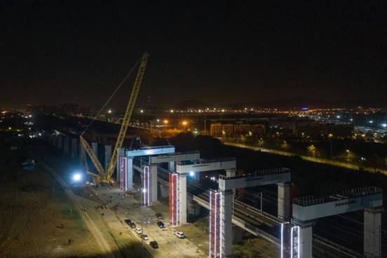 11月23日凌晨3时,随着最后一片钢横梁架设到位,由南沿江城际铁路中铁四局项目部施工的上跨宁杭高铁13处钢横梁吊装施工顺利完成,创造了华东地区跨高速铁路吊装数量最多、总重量最大的新纪录。