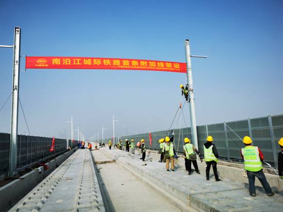 12月10日上午11时,南沿江城际铁路站后“四电”工程迎来新节点,由中国铁建电气化局集团有限公司承建的江阴至张家港区间全线第一条接触网附加导线顺利架设完成,这标志着南沿江城际铁路站后四电接触网工程全面进入上部施工阶段。