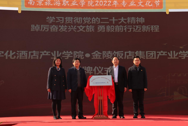 11月15日,南京旅游职业学院专业文化节暨数字化酒店产业学院·金陵饭店集团产业学院揭牌仪式在南京旅游职业学院举行。金陵饭店集团党委副书记周锦银和江苏省教育厅职业教育处副处长刘永乐为产业学院揭牌。江苏省文化和旅游厅一级巡视员陈芬、科技教育处二级调研员张人健,南京旅游职业学院领导班子成员参加揭牌仪式。