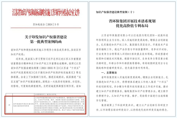 近日,江苏省知识产权和商标战略实施工作领导小组办公室印发了《关于印发知识产权强省建设第一批典型案例的函》(苏知战组办〔2024〕5号),在全省选取了10件较为突出的典型案例,供各部门、各地区在推进知识产权强省建设工作中综合借鉴。其中,“省环保集团开展技术谱系规划优化高价值专利布局”成功入选,成为省属企业唯一入选案例。
