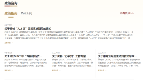 政策时效性强、信息获取渠道分散,曾是企业享受金融支持的“第一道门槛”。此次改版新增的“政策咨询”栏,以集成化思维打造了政策与新闻的聚合阵地。从最新发布的国家级政策产品及省级风险补偿政策,到金融支持实体经济的权威解读,再到行业前沿动态,用户均可在此一站式查阅,让政策“阳光”穿透“最后一公里”,也为企业科学决策提供了可靠参考。